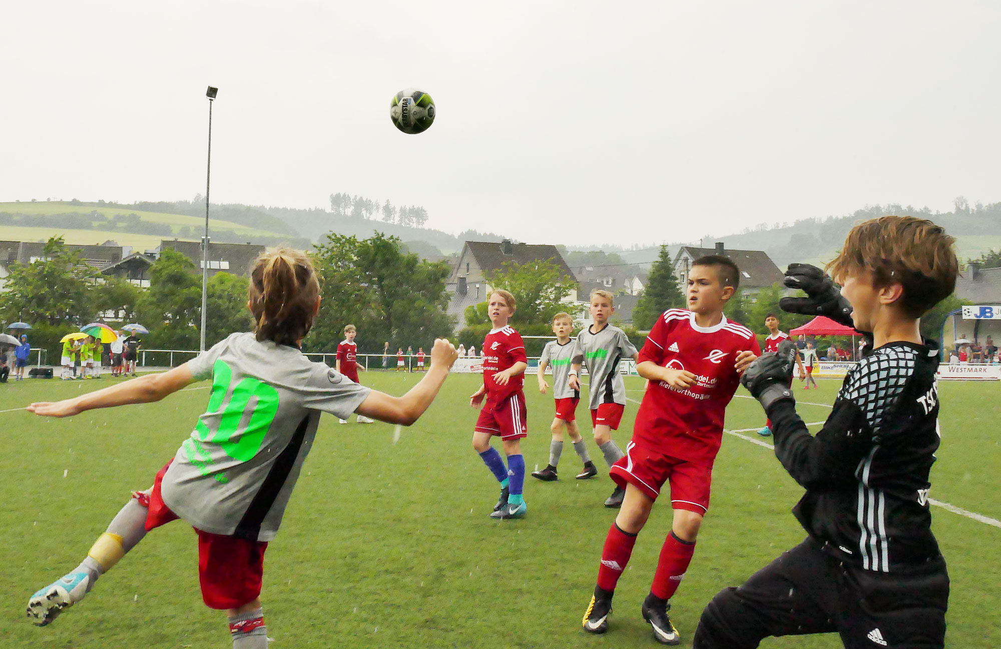 Zuvor hatten Turnierleiter Mario Eckel und seine Helfer immer wieder auf die Regenradar-App im Handy geschaut: Hält das Wetter bis zum Endspiel? Am Vortag musste Eckel kurzerhand die Reißleine ziehen und abbrechen, als 14.45 Uhr zwei Gewitterfronten den Elsper Wiesengrund einkeilten. „Die Sicherheit der Kinder hat absoluten Vorrang“, sagte er. Durch geschickte Umplanung wurde der enge Zeitrahmen dennoch eingehalten.